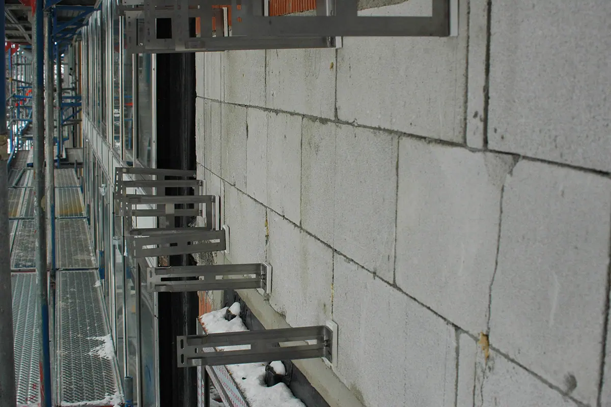 Compacfoam is used for the thermally separated installation of façade systems. Separation layers of 1-2 cm under brackets and mounting points significantly reduce heat loss through local thermal bridges. The bearings can be supplied pre-assembled or cut from panels on site. Adaptations with milling to system components are possible without any problems.