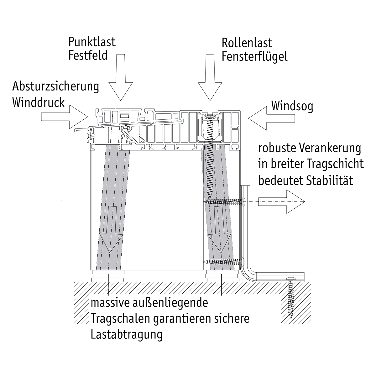 - Wind pressure, wind suction and ETB forces are absorbed by the counter-milling and the mounting bracket.
