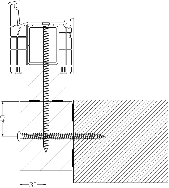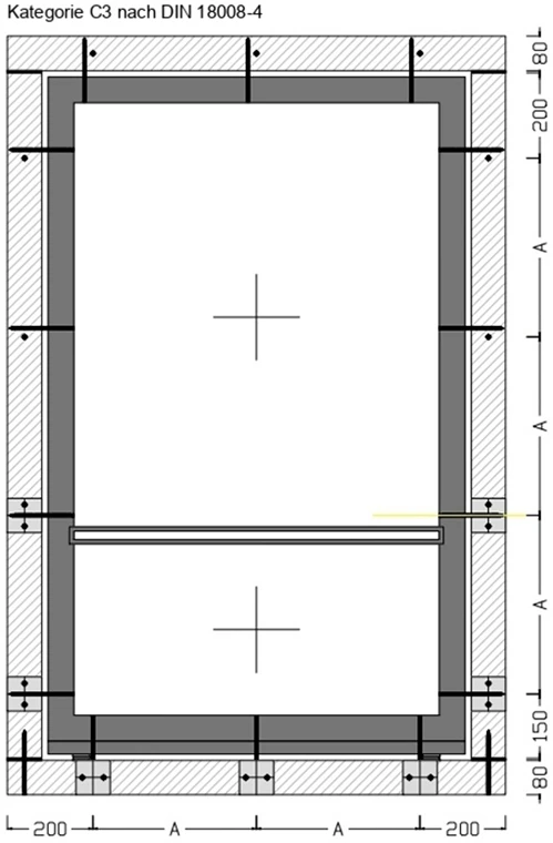 For elements with fall protection properties (ETB), depending on the respective category (A / C2 / C3), the window profile must also be secured with a second screw (twin screw). The screw spacing is 80 mm, the edge distance is at least 40 mm to the outside of the pre-wall mounting profile, and the screw-in depth into the pre-wall mounting profile must be 80 mm.