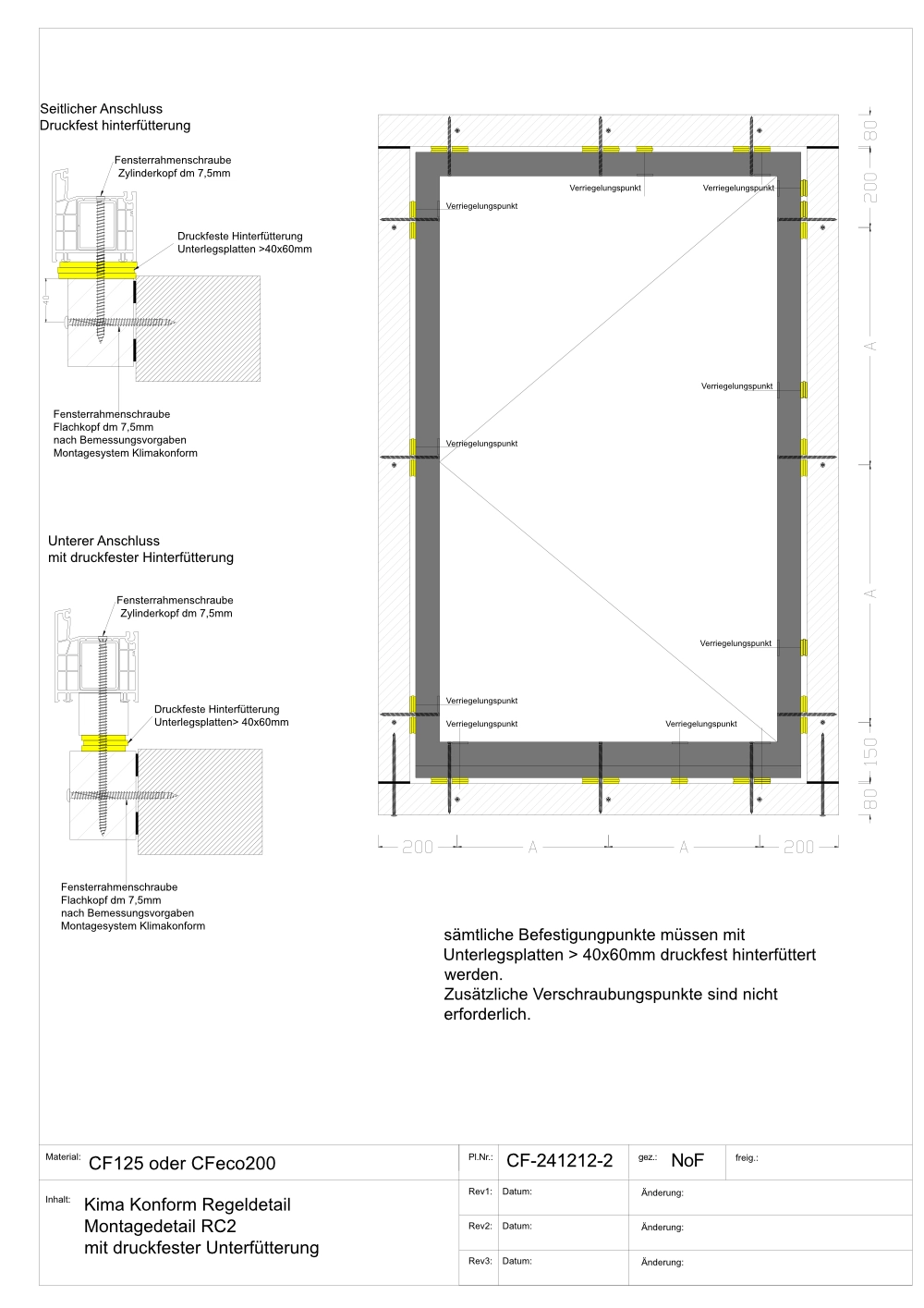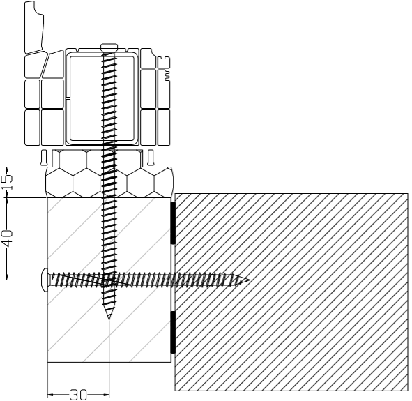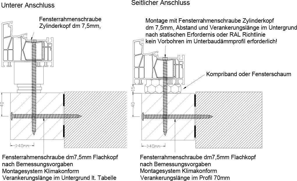 B….max. distance between supports at the bottom <500mm, arrangement under corner points of the fixed panel Window frame screw cylinder head ø 7.5mm, distance and anchoring length in the substrate according to static requirements or RAL guideline. No pre-drilling required in the substructure insulation profile!