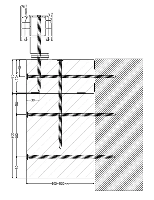 Window frame screw cylinder head ø 7.5mm, distance and anchoring length in the substrate according to static requirements or RAL guidelines. No pre-drilling required in the substructure insulation profile!
