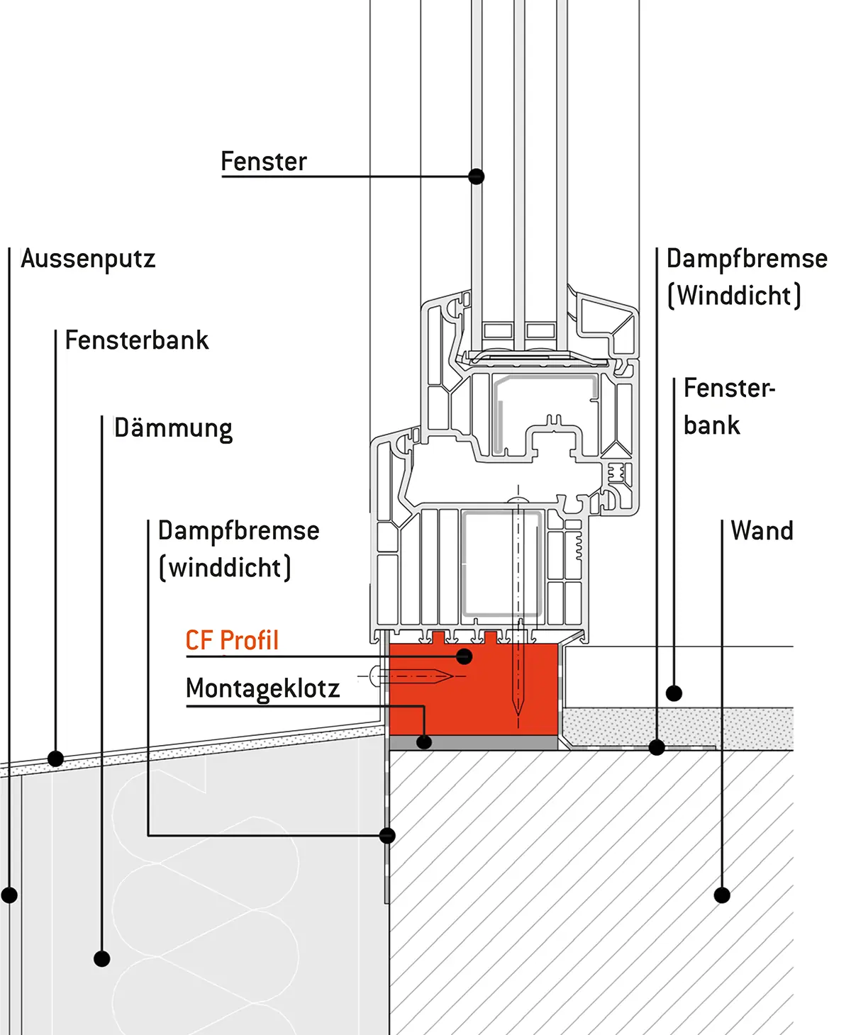 The CF window sill connection replaces conventional PVC window sill connection profiles. With the optimum lambda value of COMPACFOAM, condensation and mold formation in the FBA area are a thing of the past. Due to the high strength of CF-FBA, the window sill can be fixed with special window sill screws without any problems. In conjunction with a PVC coating, the window sill can also be fixed with standard window sill screws.