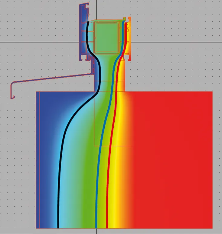 Il sistema di installazione pre-murale Klima Konform migliora le curve di temperatura tra il sistema a parete e la finestra. Le isoterme mostrano chiaramente i vantaggi dell’installazione pre-murale rispetto all’installazione convenzionale.